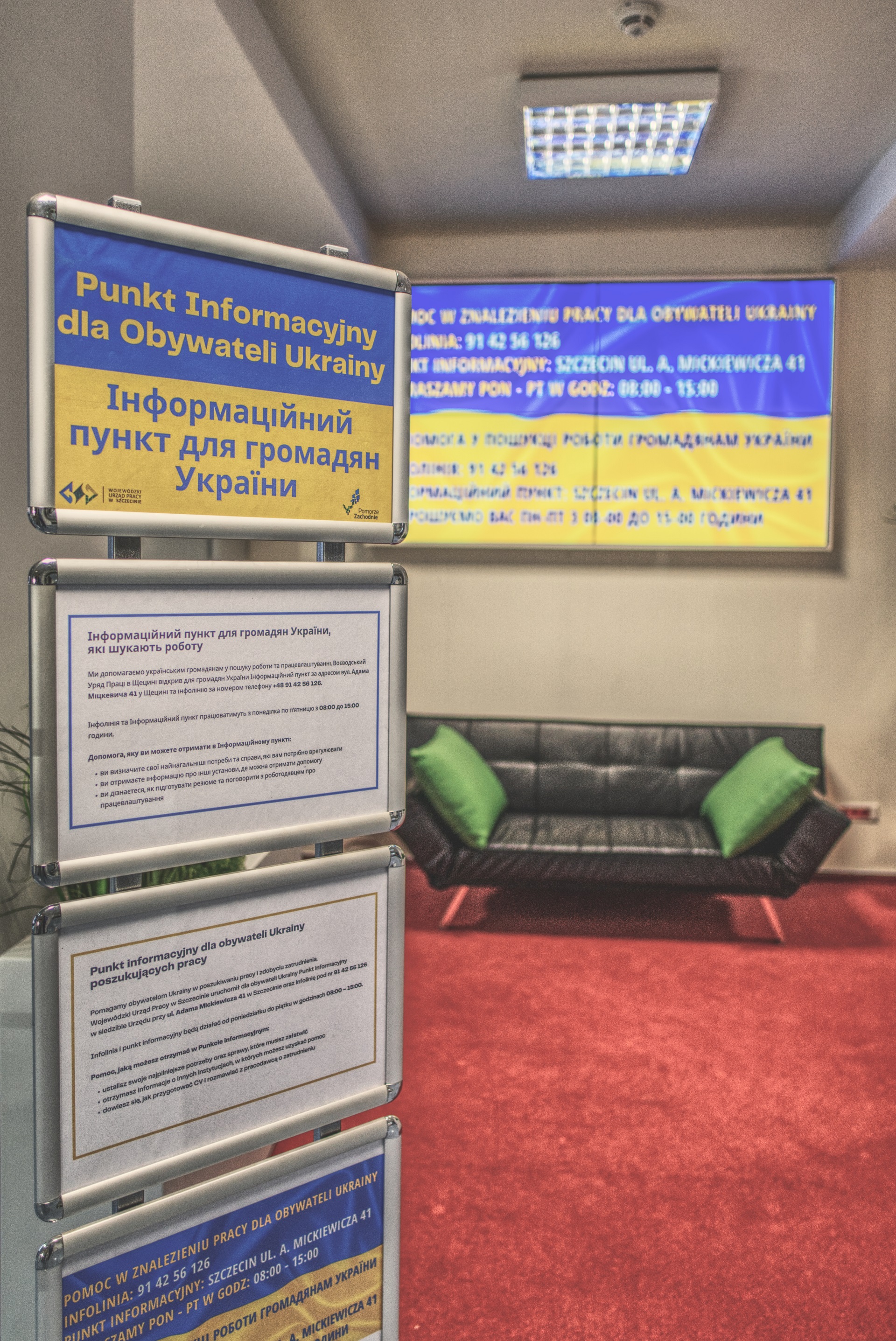 Wojewódzki Urząd Pracy w Szczecinie uruchomił Punkt informacyjny dla obywateli Ukrainy w siedzibie Urzędu przy ul. Adama Mickiewicza 41 w Szczecinie oraz infolinię pod nr 91 42 56 126.